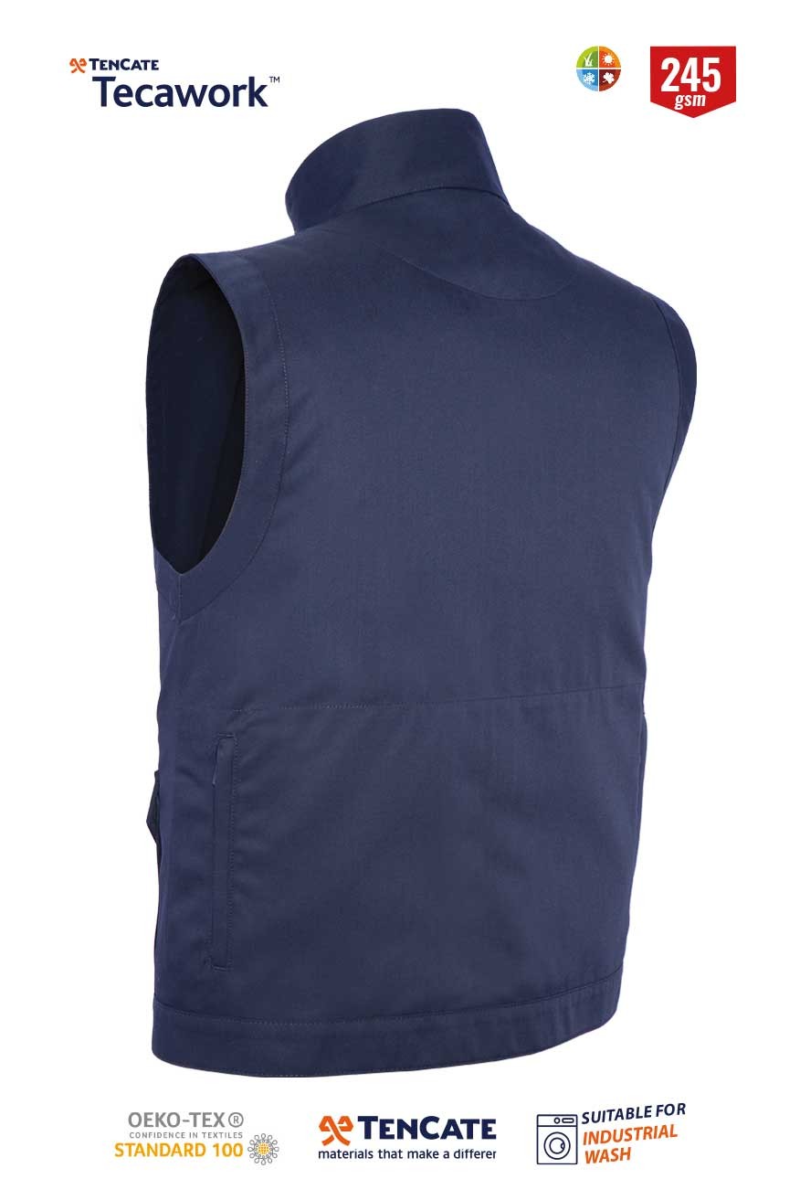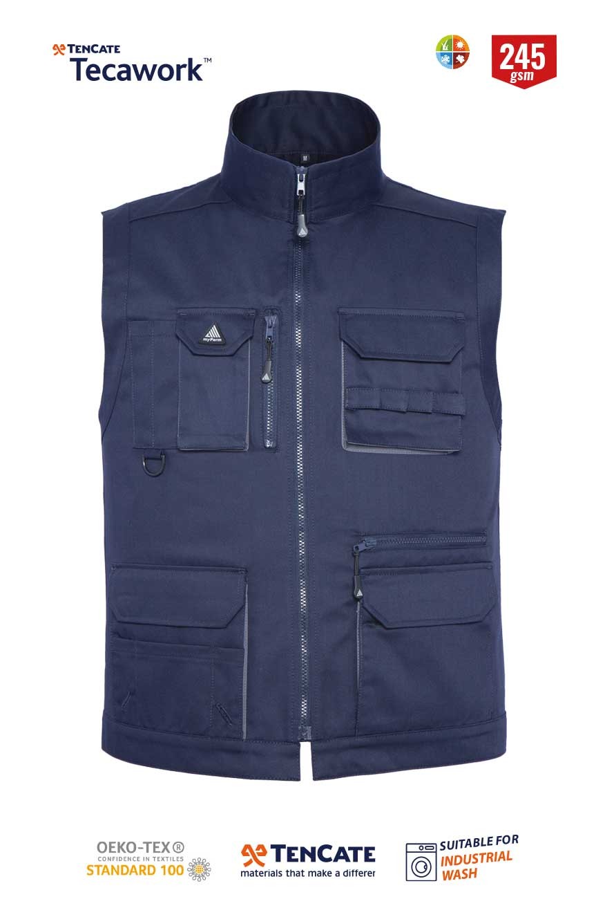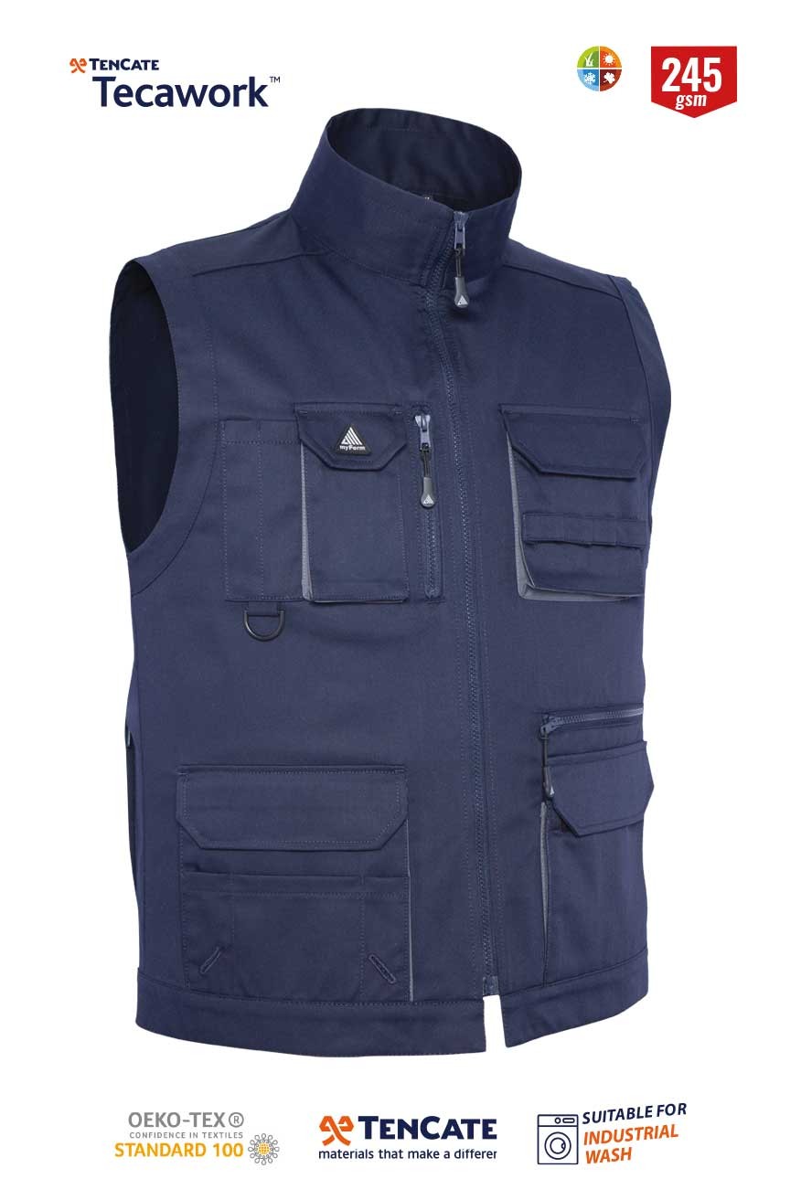 Onlarca yıldır dünyanın dört bir yanındaki işçiler Tecawork® poli-pamuk ve pamuk açısından zengin karışımlar giyiyor. Bu kumaşların konforunu ve kalitesini takdir ederken, Avrupa’nın önde gelen iş elbiseleri üreticileri ve endüstriyel çamaşırhaneleri, defalarca endüstriyel yıkamadan sonra bile dayanıklılıklarına ve mükemmel renk performanslarına değer veriyor. Myform Metron Plus Koleksiyonu yüksek kaliteli Tencate kumaşlarla üstün konfor ve pratiklik için üretilmiştir. Yumuşak dokulu %65 polyester, %35 pamuk kumaşlar uzun ömürlüdür ve şık bir görünüm sağlar. Polyester giysilere sağlamlığı getirirken, pamuk oranı ise yüksek derecede yıkanmayı sağlar. Koleksiyonun her bir parçası ihtiyaçlarınıza göre dizayn edilmiş multi-fonksiyonel ceplere ve kullanışlı birçok özelliklere sahiptir. Metron yelek kullanıcısına pratik kullanım ve özgün bir görünüm sunar. Birçok kullanışlı cebi ile güvenli saklama alanıyla birlikte uzun ömürlü bu yelek endüstriyel yıkama şartlarına uygundur. Myform plus collection ailesinin vazgeçilmez parçasıdır. Telefon cebi Fermuarlı cep Telsiz halkası Metre cebi Yan cepler Kalem cepleri Göğüs cebi Fermuarlı derin iç cep Derin cep yapısı Yeleğin arka kısmında, her iki taraftaki bulunan fermuarlı derin cep yapısı