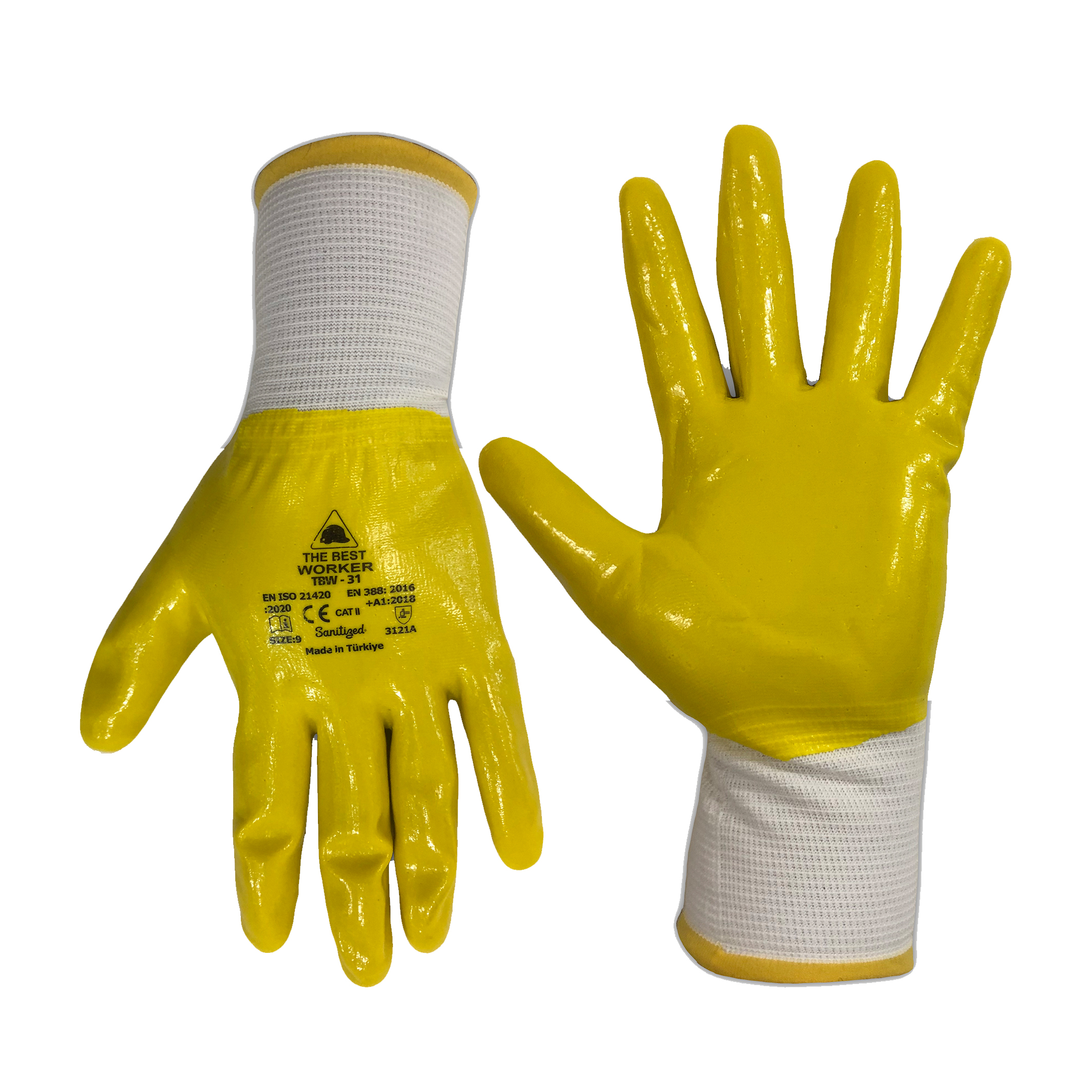 Polyester örgü eldiven Sarı nitril kaplama, avuç içi ekstra kaplama 4121A EN 388:2016 EN ISO 21420 Sterilize, Cat II 8-9-10